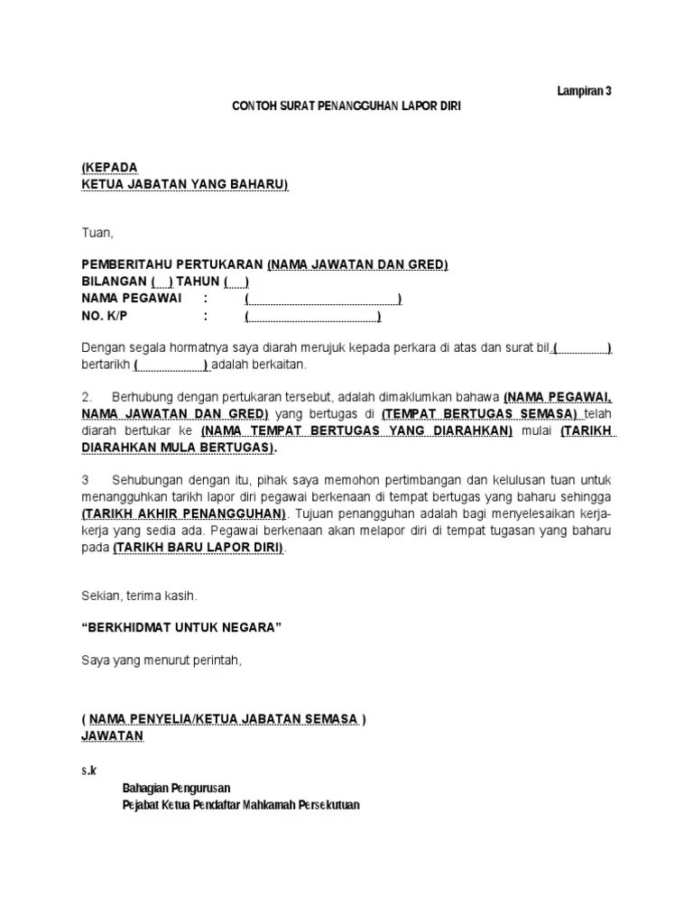 Surat penangguhan lapor diri via www.scribd.com. Contoh surat rayuan pertukaran penempatan kkm barrels, contoh surat rayuan pertukaran. 7/18/2019 contoh surat penangguhan lapor diri 1/3contoh surat penangguhan lapor diri(kepadaketua jabatan yang baharu)tuan,pemberitahu pertukaran (nama . Contoh surat penangguhan lapor diri via www.slideshare.net. Apa pun perlu beradab, tak dapat masuk.
